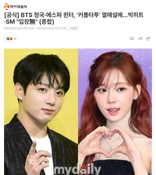 对此,柾国所属社Big Hit与Winter所属社SM于5日向媒体MyDaily谨慎回应称"暂无官方立场"。
