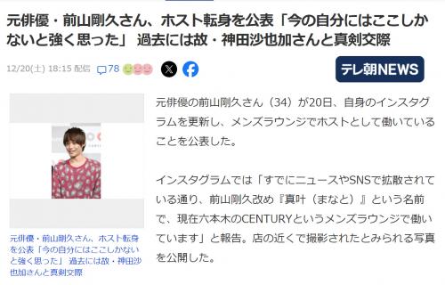 前山刚久最为人知的标签,是已故知名女星神田沙也加的前男友。2021年12月,时年35岁的神田沙也加在札幌一家酒店的房间里去世,警方调查后推断为自杀,其死因引发社会巨大关注与悲痛。