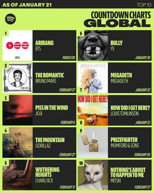 中国娱乐网讯 www.yule.com.cn 据Spotify 21日(当地时间)数据显示,防弹少年团的新专辑《ARIRANG》登顶"Countdown Charts Global榜首。该榜单统计的是新作品发行前在全球范围内被预存次数最多的作品。