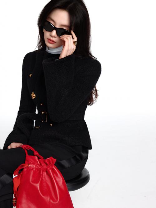 点睛之笔莫过于手中那只红色的Crystal Pouch手袋。黑与红的冷暖碰撞,打破了全黑穿搭的沉闷,让整体造型瞬间鲜活起来。她站在夜色里,没有多余的装饰,却凭借优越的体态和清冷优雅的气质,把“行走的衣架”这个称号稳稳焊在身上。