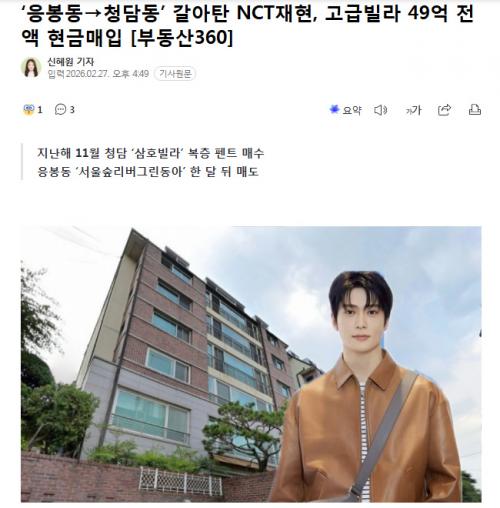 中国娱乐网讯 www.yule.com.cn 据韩媒27日报道,NCT成员在玹于去年11月29日以49亿韩元的价格购入位于首尔江南区清潭洞的一处高级别墅,并于本月23日结清尾款、完成所有权转移登记。由于该房产在登记过程中未设定任何抵押权,外界普遍推测此次交易为全额现金支付。