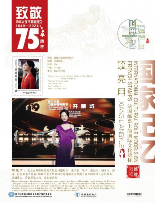 鉴于项亮月在中国影视领域上的杰出成就,以及为国际文化交流所作出的卓越贡献,业经中国国际文化艺术交流发展中心、欧洲集邮协会、山水丹青国际艺术中心、艺术财经杂志等海内外权威文化机构组织推荐,联合国世界非物质文化遗产保护基金会授予项亮月“国际文化榜样”荣誉称号。这不仅是对中国艺术家杰出成就的肯定和赞誉,也是向新中国成立75周年崇高的致敬!更是献给2024世界“文化遗产日”最好的文化礼物!