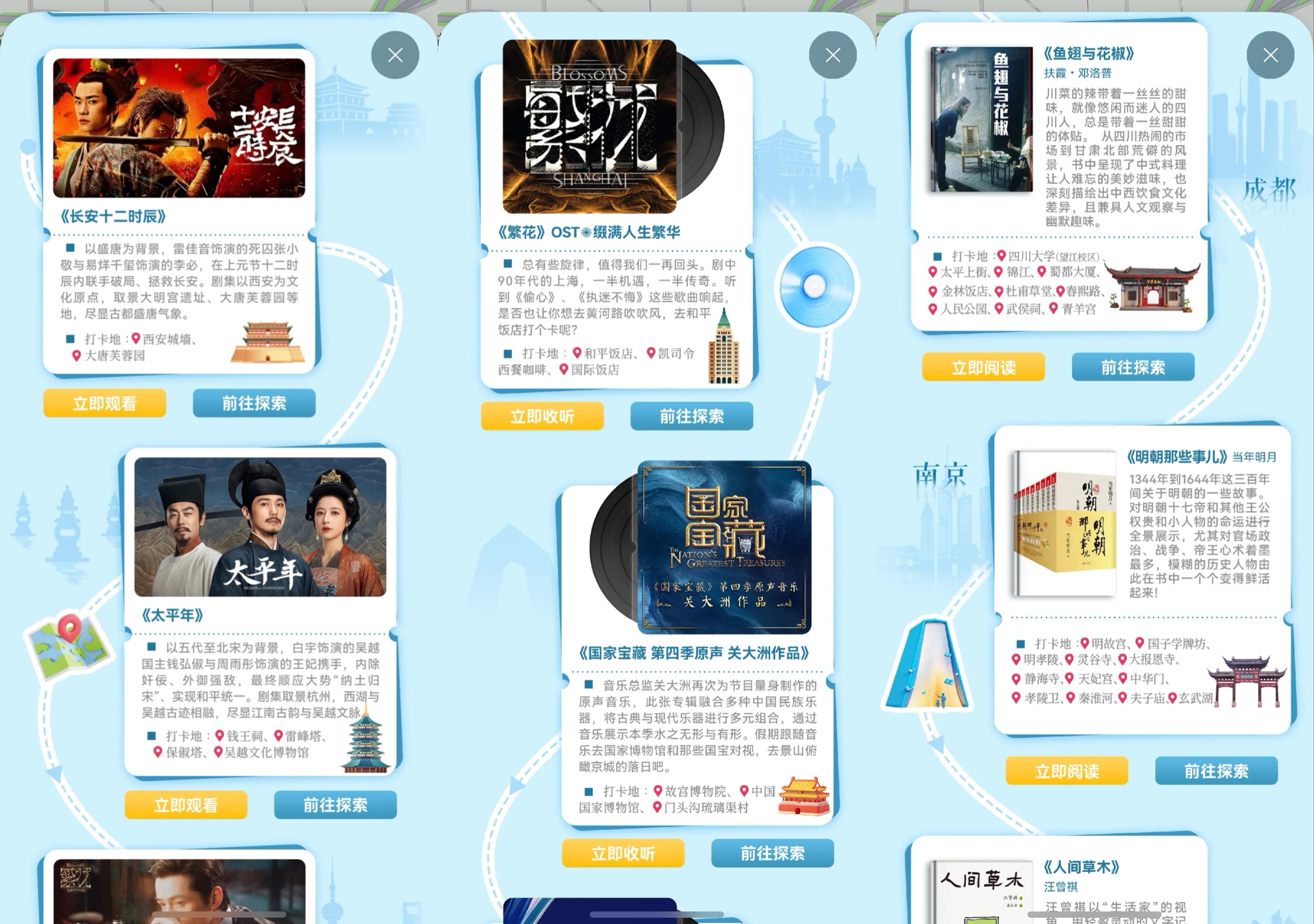 用户在花瓣地图或华为视频、华为音乐、华为阅读App中找到对应主题活动,即可一站式发现那些藏在影视作品、音乐旋律、书页文字中的真实地点。比如在西安,你可以跟随《长安十二时辰》的脚步,在活动界面里一键解锁那些大唐盛世的现实坐标;在上海,则能踏足《繁花》中主角曾生活过的街道,让每一次出发都充满故事感与情感连接。
